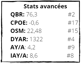 Normalement ça aurait dû être les EPA par play, mais cette statitistique n’étant pas facilement accessible je me suis rabattu sur le QBR basé sur le même esprit. On mesure le succès d’un QB à chaque fois qu’il touche la balle que ce soit quand il lance ou quand il court.