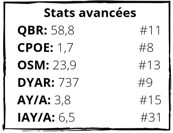 QBR : A ne pas confondre avec le QB rating. C’est une stat créée par ESPN, qui prend en compte les drop et pleins d’autres composantes du jeu pour avoir un rating plus juste. Il est noté de 0 à 100. Plus on se rapproche de 100 plus l’équipe a, théoriquement, de chances de gagner. C’est une statistique qui traduit l’efficacité d’un QB.
